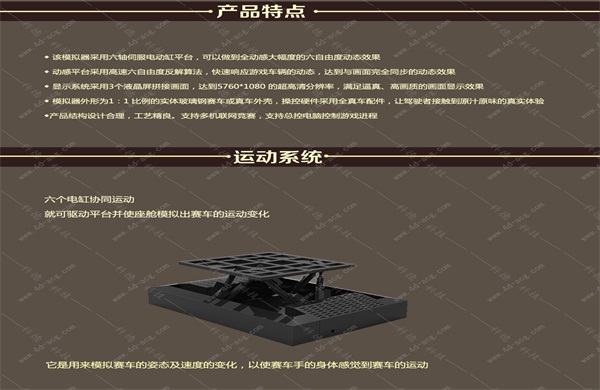 简介:F1赛车模拟器是一种能够正确模拟赛车驾驶动作,获取实车驾驶感觉的电子模拟设备。动感产品分为液压驱动、气压驱动、电机驱动等,其中伺服电机驱动动感效果较好。采用液压 气压驱